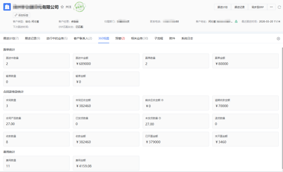 客户360视图:集成客户全维度数据、全量沟通记录(电话、拜访、微信、邮件)、合同文件、回款情况、费用明细等数据,形成统一客户档案,销售人员与管理者足不出户即可掌握客户全维度情况,告别信息分散与查询低效问题。